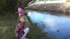 The views were spectacular on the way back into Vernal.  We still had some morning left when we arrived in Vernal, so we took the kids to the Kid's Canal in Vernal where they could go fishing.  We saw 2 fish about 4 inches long, but they weren't biting the powerbait we brought.  Amara did catch something, though...