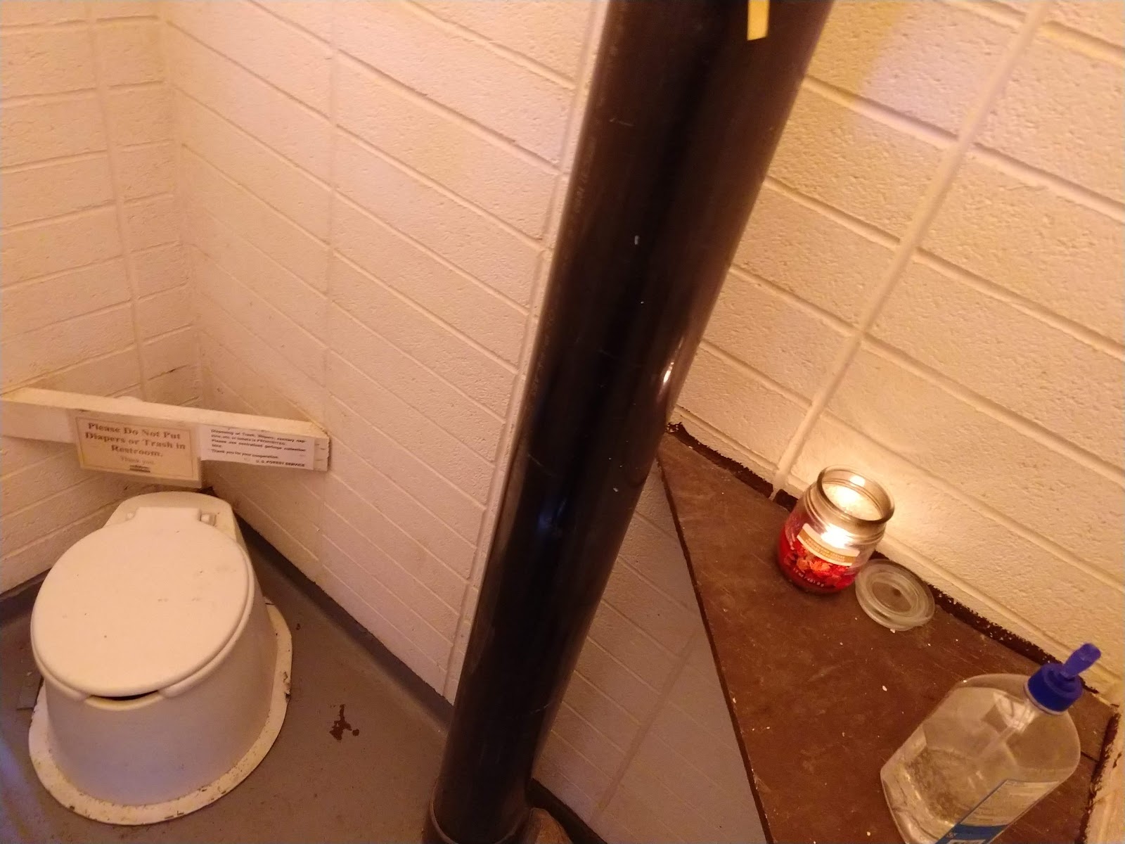 | This bathroom was actually the nicest latrine I've visited. It didn't stink, had hand sanitizer and a candle burning! |